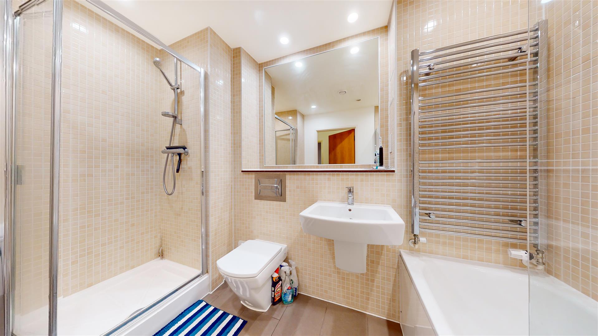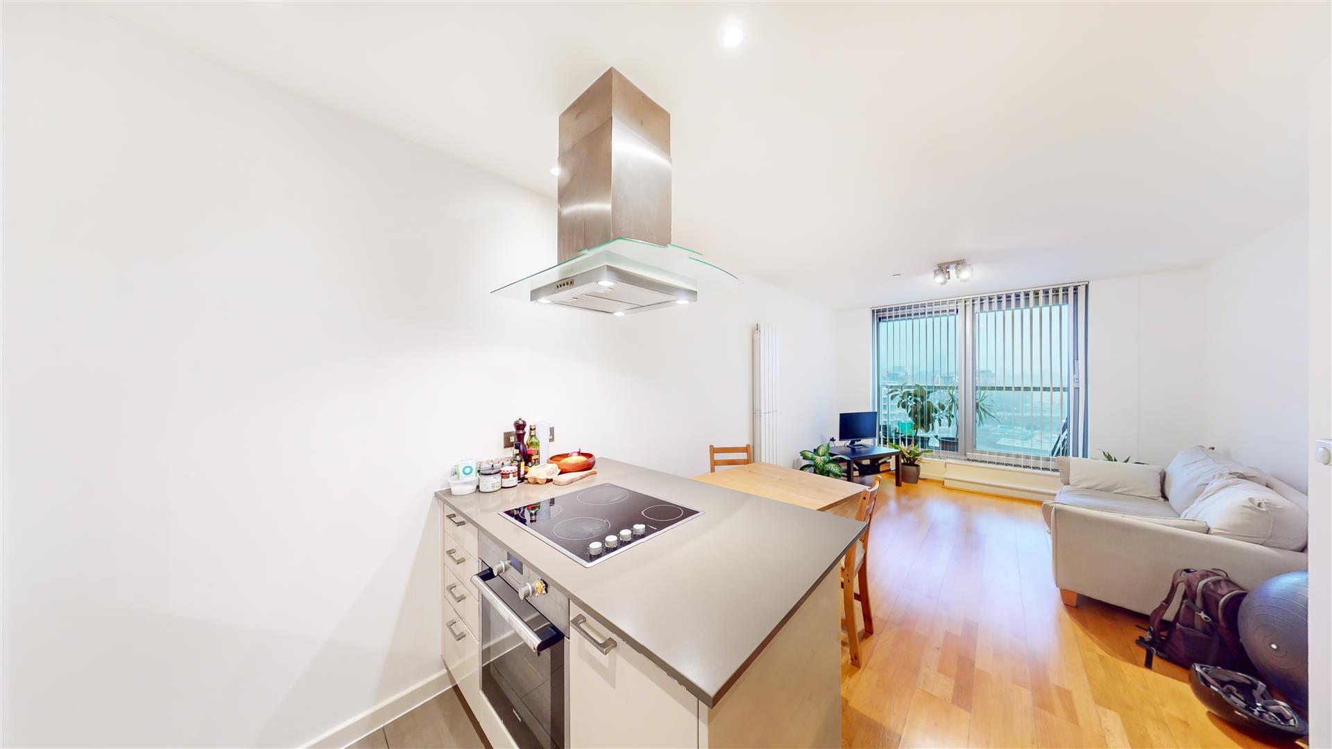 The apartment boasts a spacious open-plan living and kitchen area, complete with integrated appliances, sleek wooden flooring, and dual-aspect floor-to-ceiling windows that flood the space with natural light. The generously sized double bedroom includes fitted wardrobes, while the contemporary bathroom features both a bathtub and a walk-in shower. A large hallway storage cupboard adds valuable practicality.