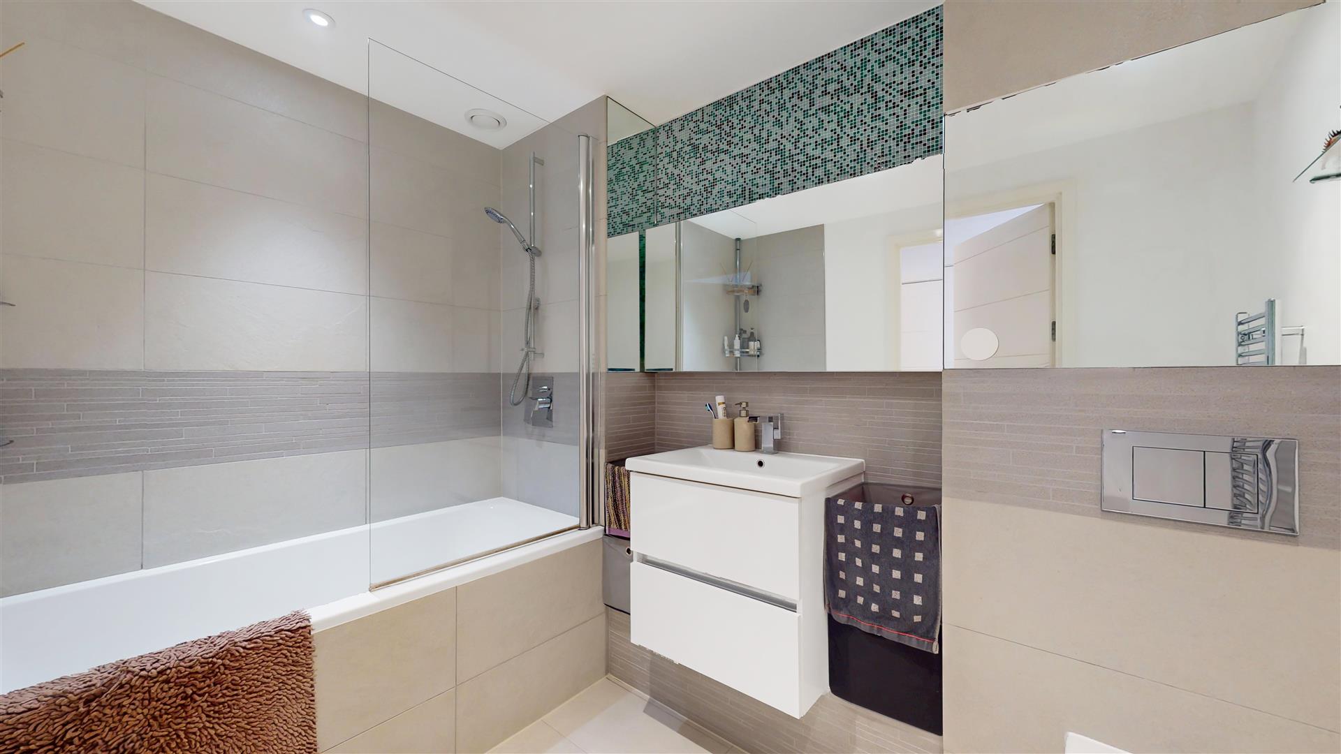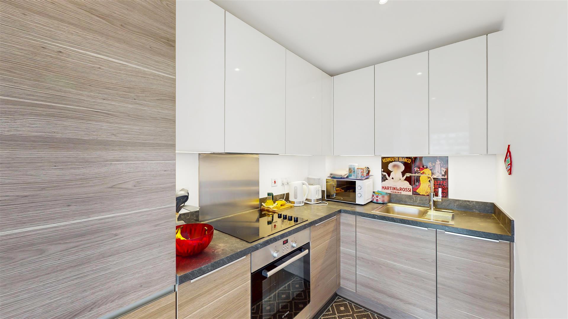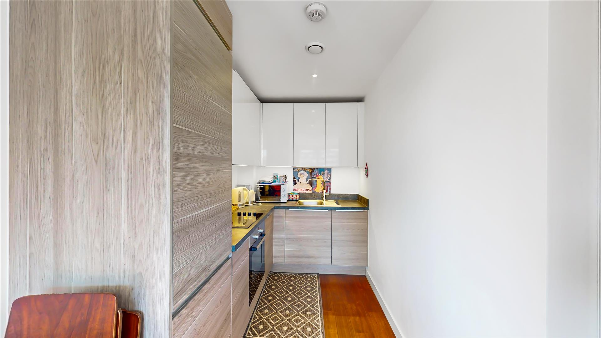 The apartment features a spacious double bedroom with built-in wardrobes, a stylish family bathroom, and a bright, open-plan kitchen and living area with dual-aspect windows and a Juliette balcony. The kitchen is fully fitted with integrated Bosch appliances, including a dishwasher and washer/dryer, providing both convenience and a sleek contemporary look. Also includes two storage cupboards in hallway .