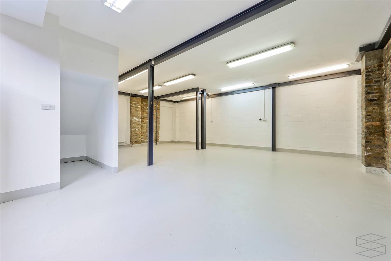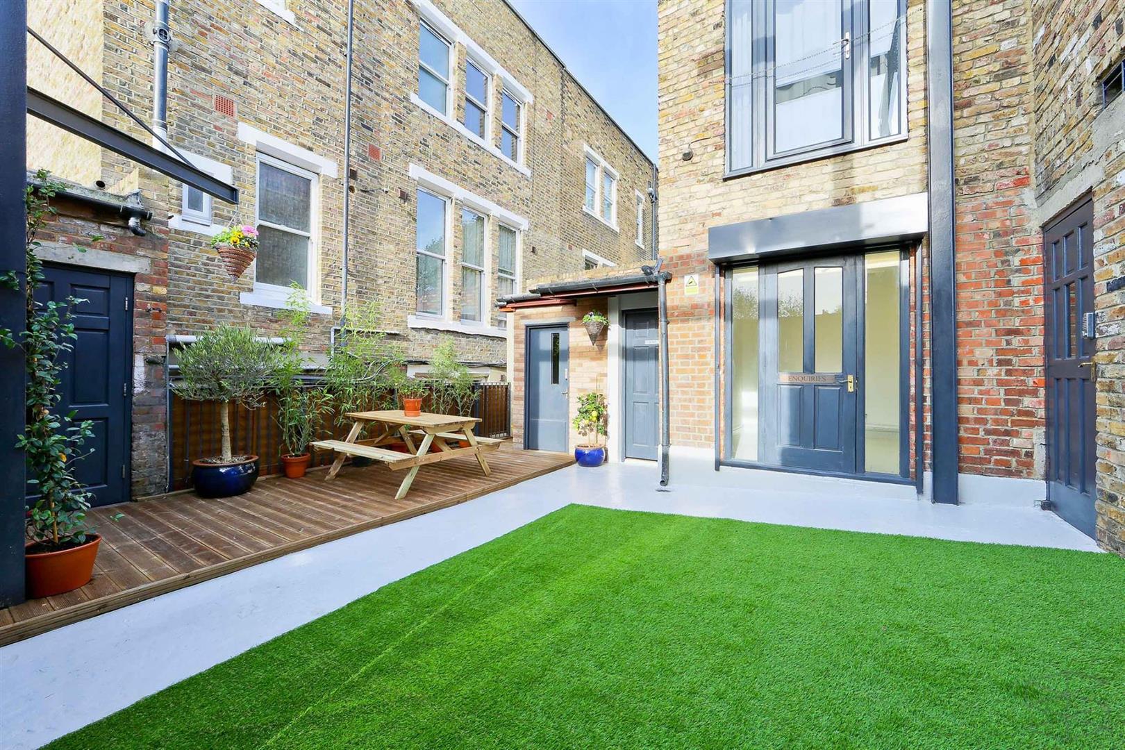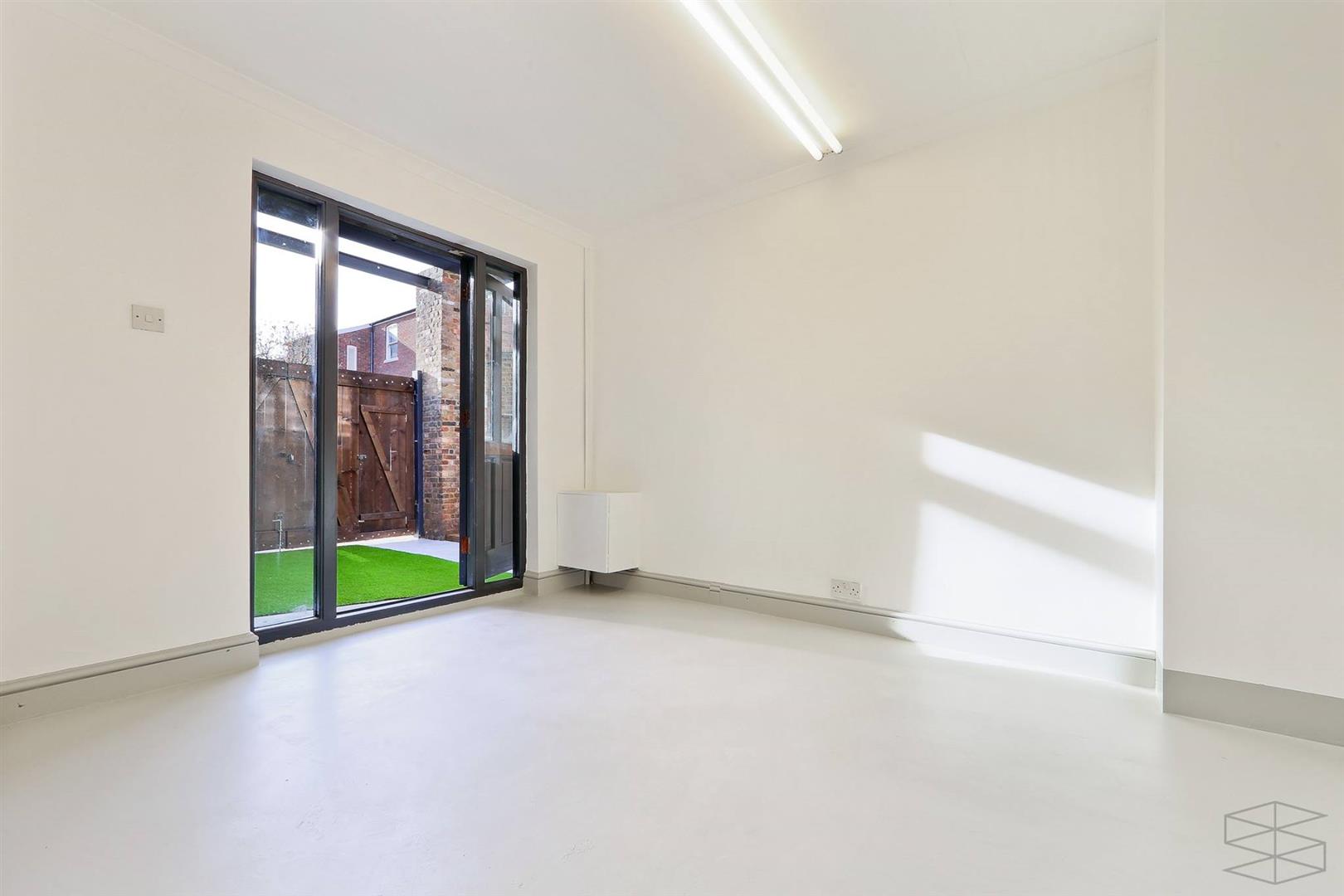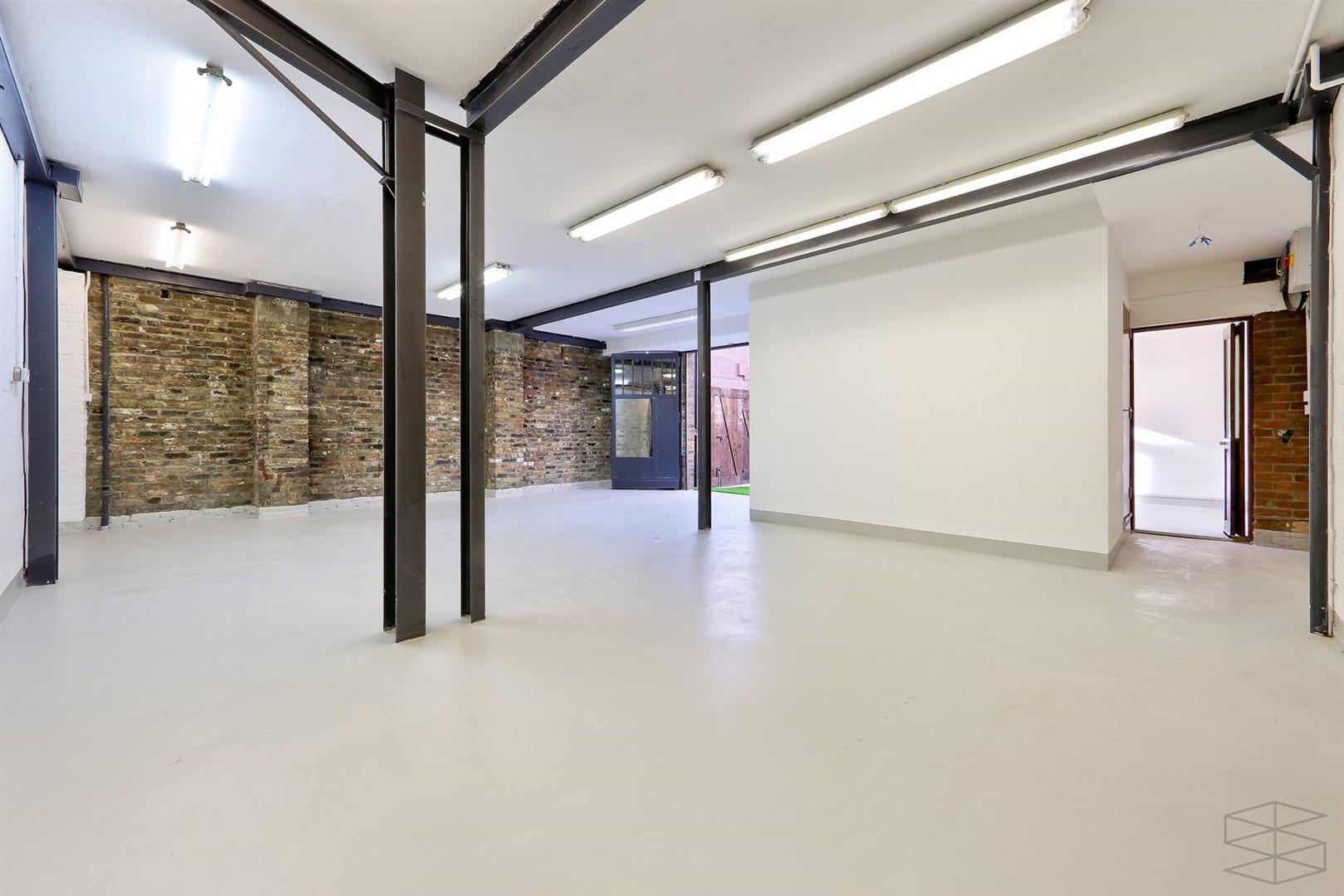 This spacious 880 sq ft ground-floor studio, complemented by a 500 sq ft shared courtyard, is versatile for various commercial purposes. It boasts a modern industrial aesthetic with exposed brick and steel columns, plus expansive full-height doors that lead to a charming landscaped garden. Additionally, there's a meeting room or private office featuring a glass door opening to the garden. The generous dimensions provide plenty of room to display your products or services attractively and welcomingly. The property's design is adaptable, offering the liberty to craft a distinctive and captivating space for your clientele.
