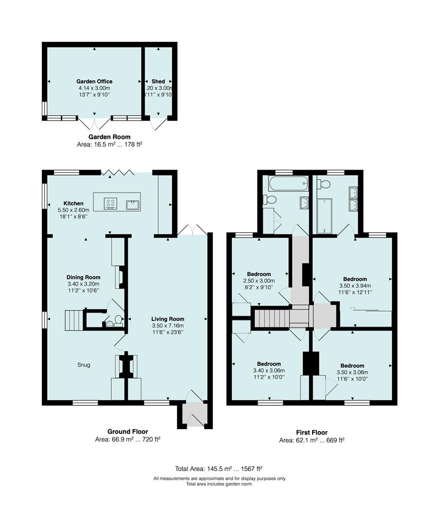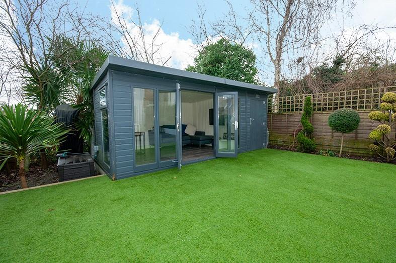 The open plan ground floor is a standout feature, creating a seamless flow between the living areas, ideal for family gatherings or hosting friends. The ground floor also includes a convenient toilet with large bi-fold doors leading out to the south facing rear garden making it an impressive entertaining space. The low maintenance garden is a true gem, complete with a stylish slate terrace and an artificial grass area, ensuring you can enjoy it without the hassle of extensive upkeep. Additionally, a versatile garden room, complete with an attached garden shed, offers endless possibilities for use as a home office, studio, or playroom.