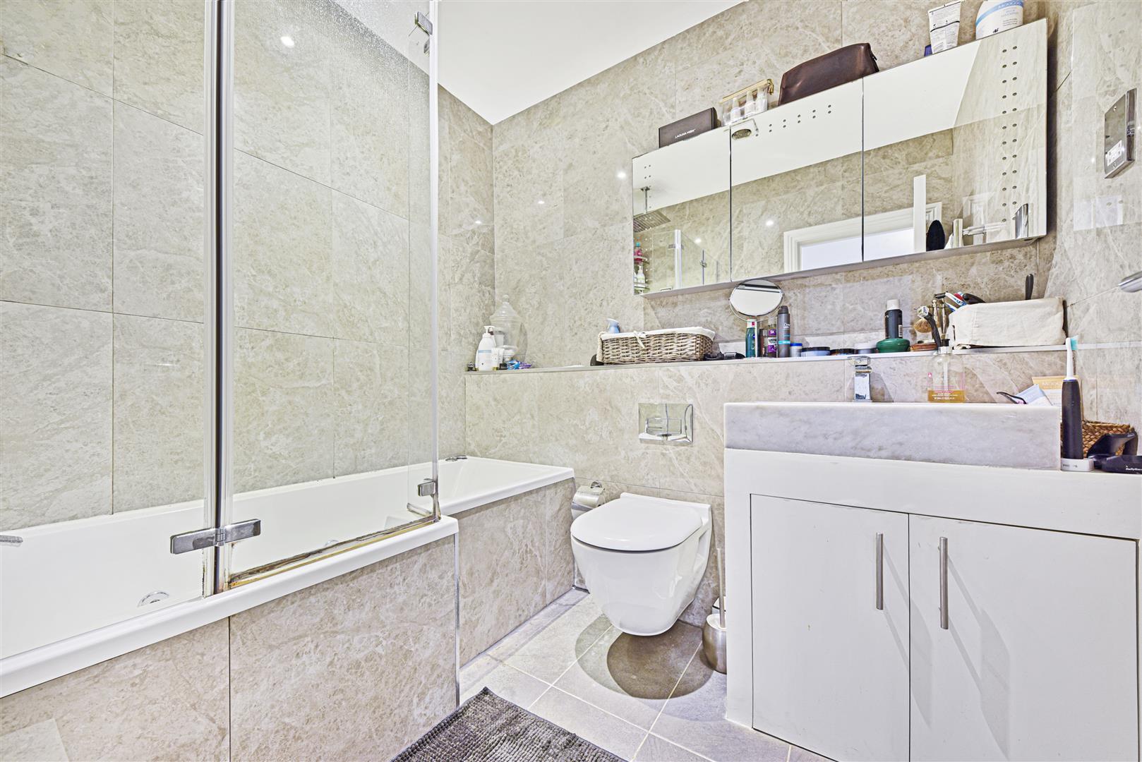 The is a modern fitted family bathroom and ample storage space.