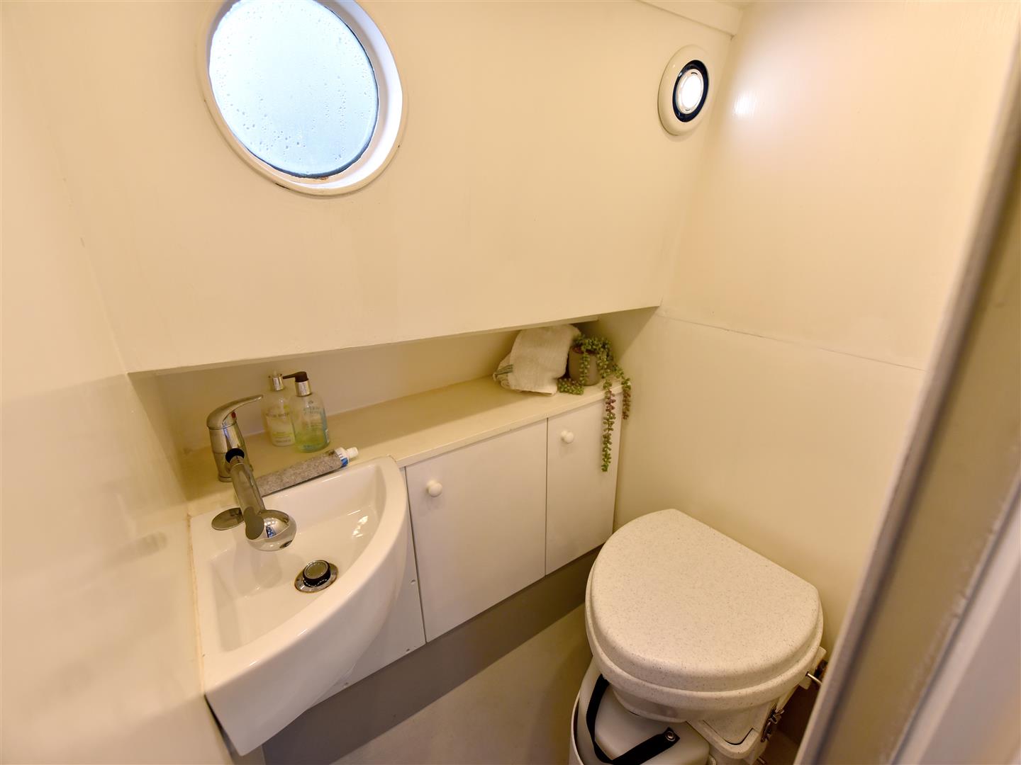 Moving forward, through the elliptical aperture, the cabin has a fixed double bed and a good level of clothes storage. The heads are on the starboard side, with compositing loo, basin and shower. Although it is important to note, there are very good onshore facilities.