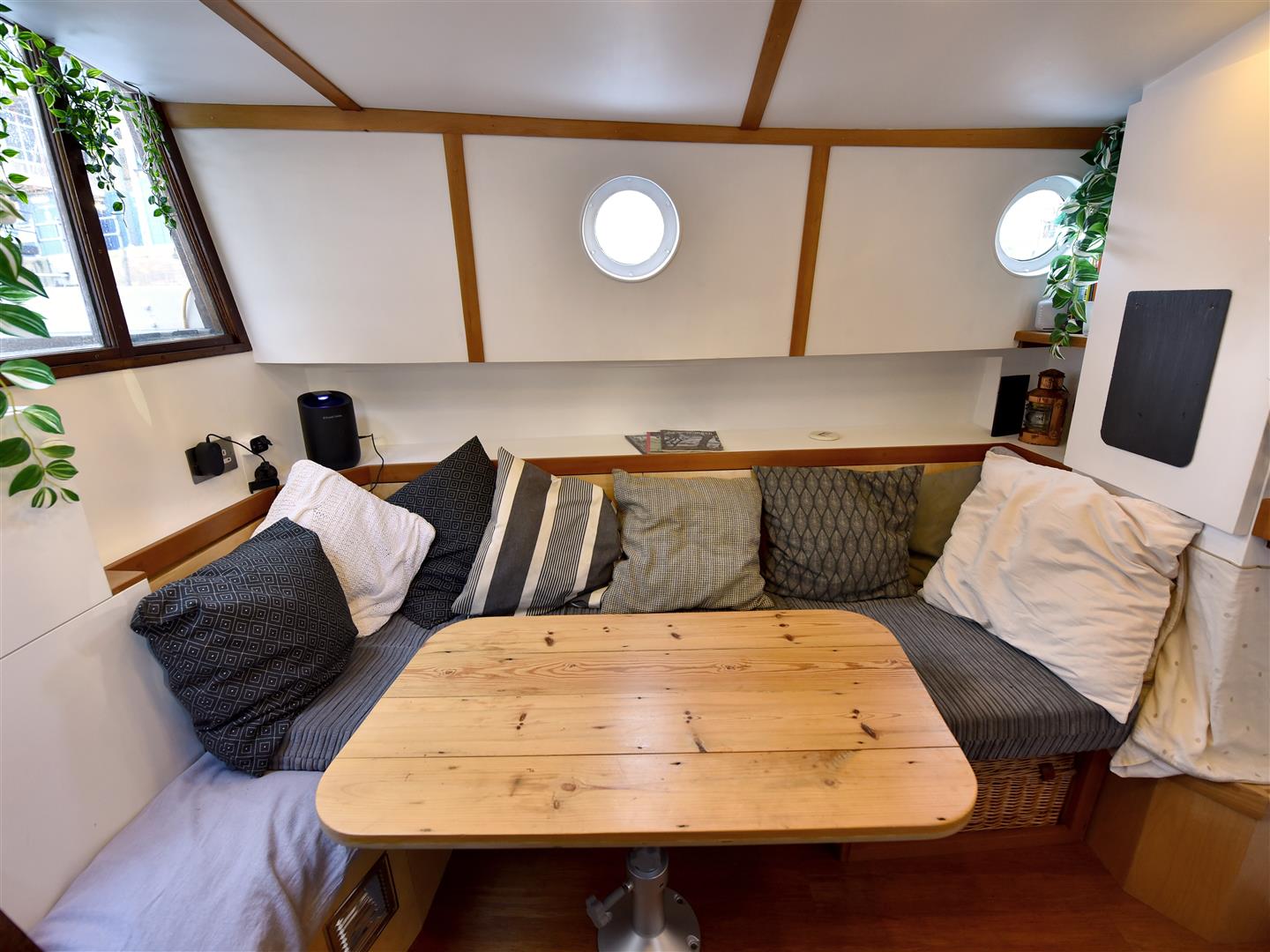 The interior has been carefully designed with a modern, clean aesthetic while maintaining the traditional character of the vessel.