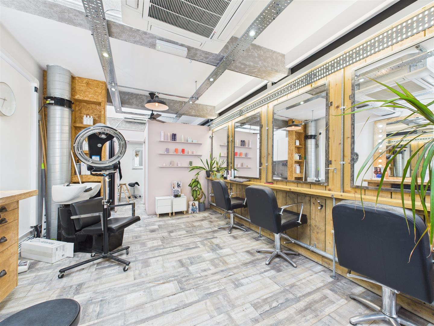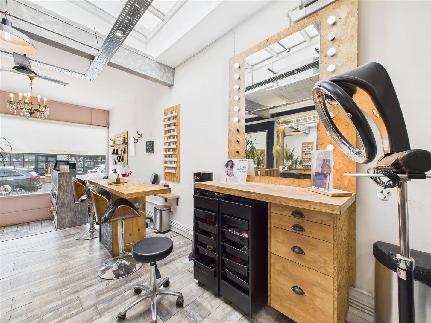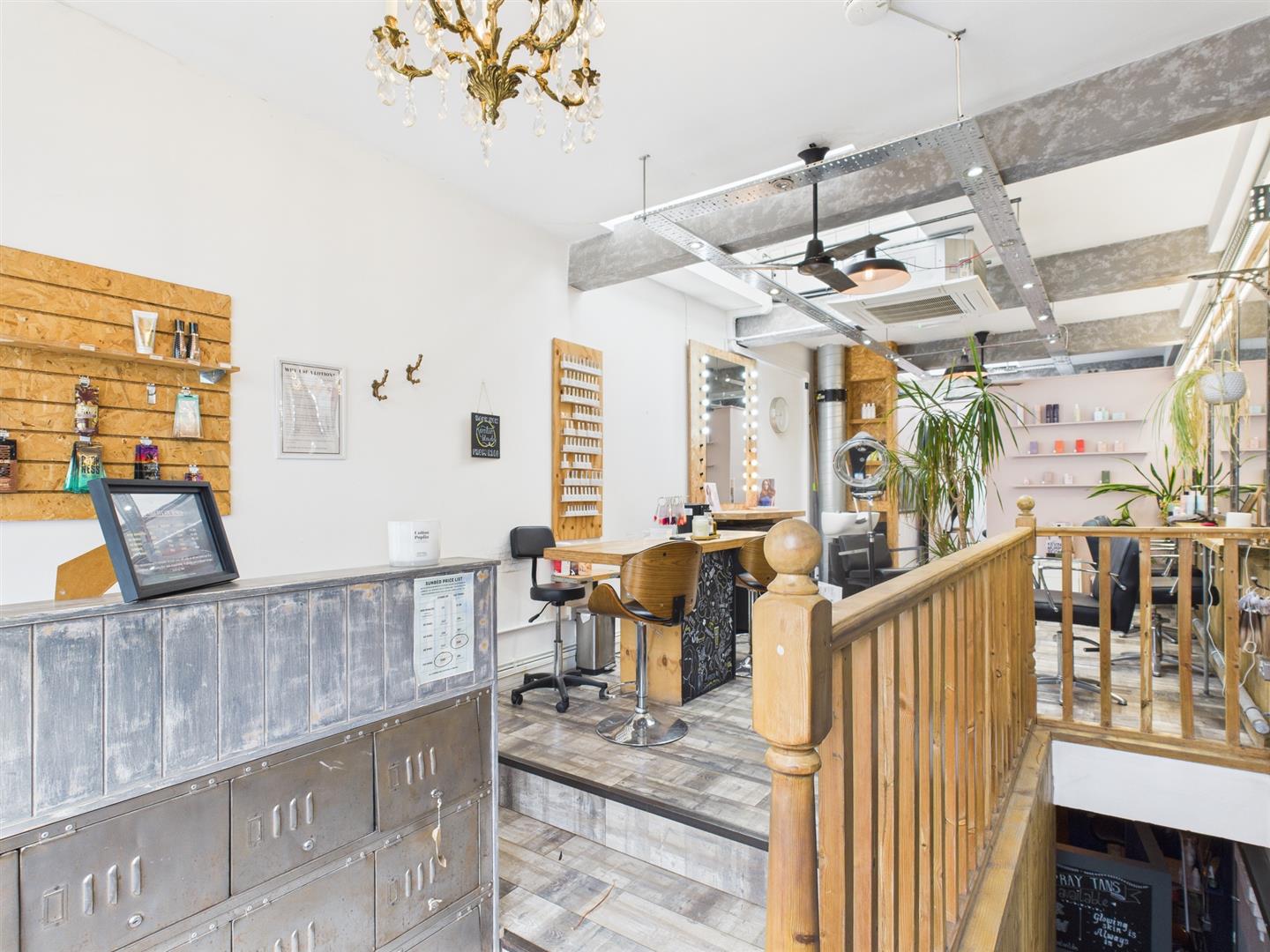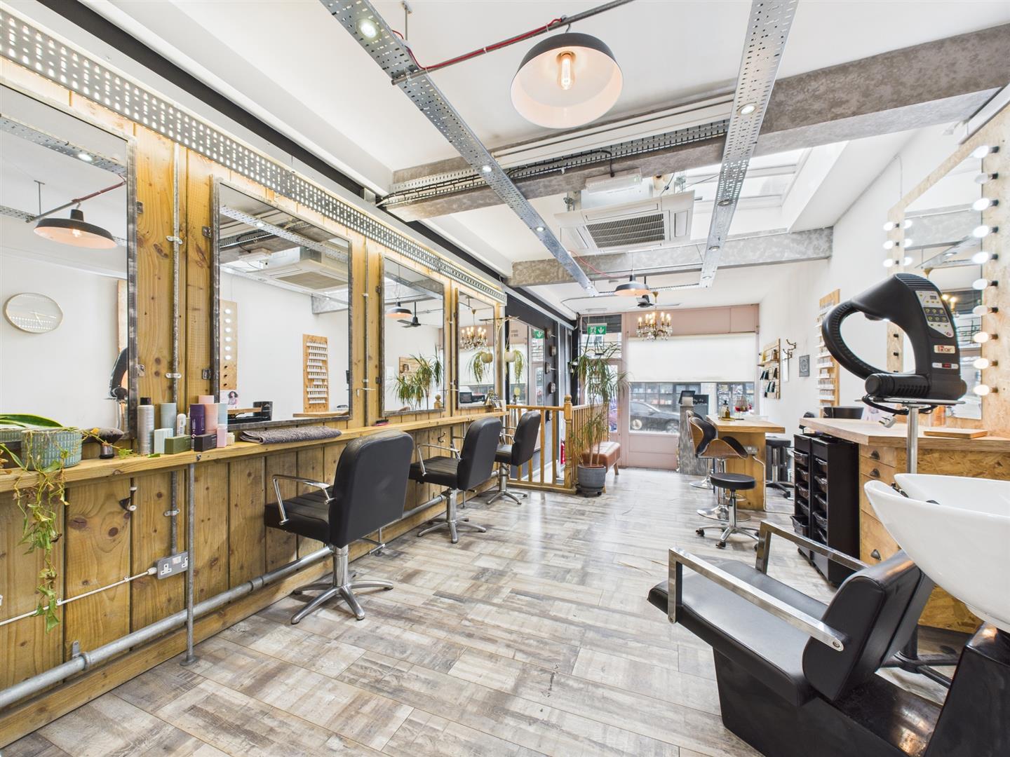The property features electric roller shutters leading into the unit’s reception area, which has a custom-made front desk and stairs leading up to the main floor which is home to a nail bar with 2 customer stations along with 6 hairdressing stations. Skylights bring in plenty of natural light. There is a colour mixing station with sink, as well as a kitchenette (including a washing machine) and a private treatment room to the rear of the property.