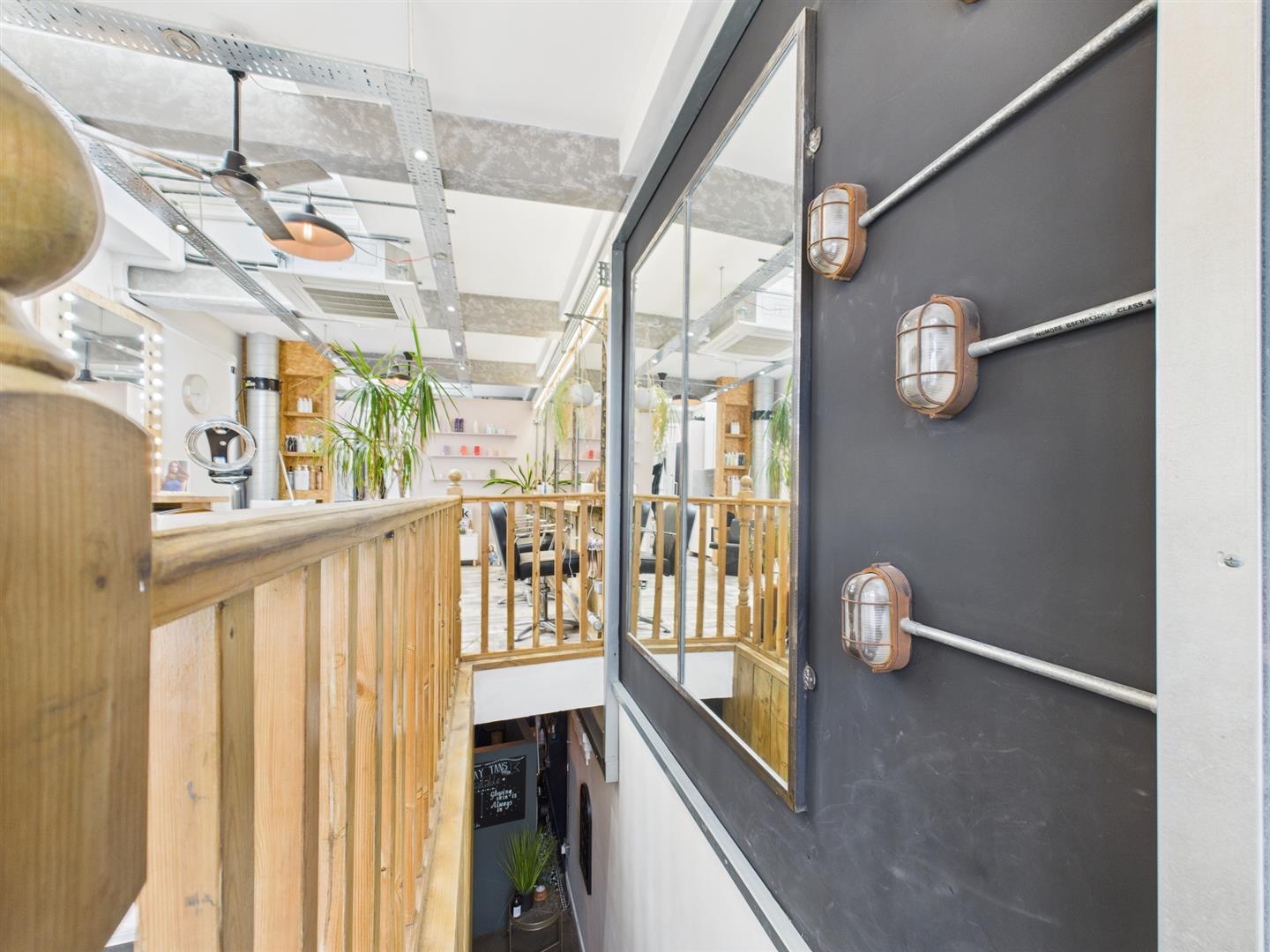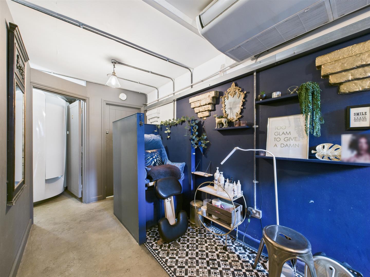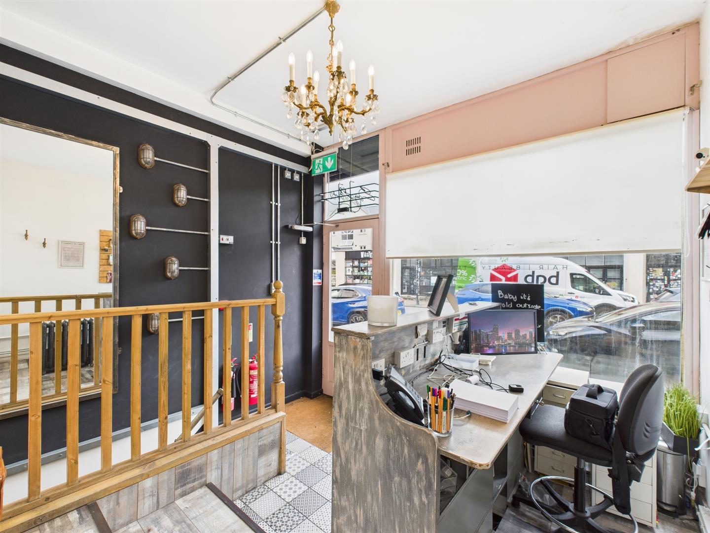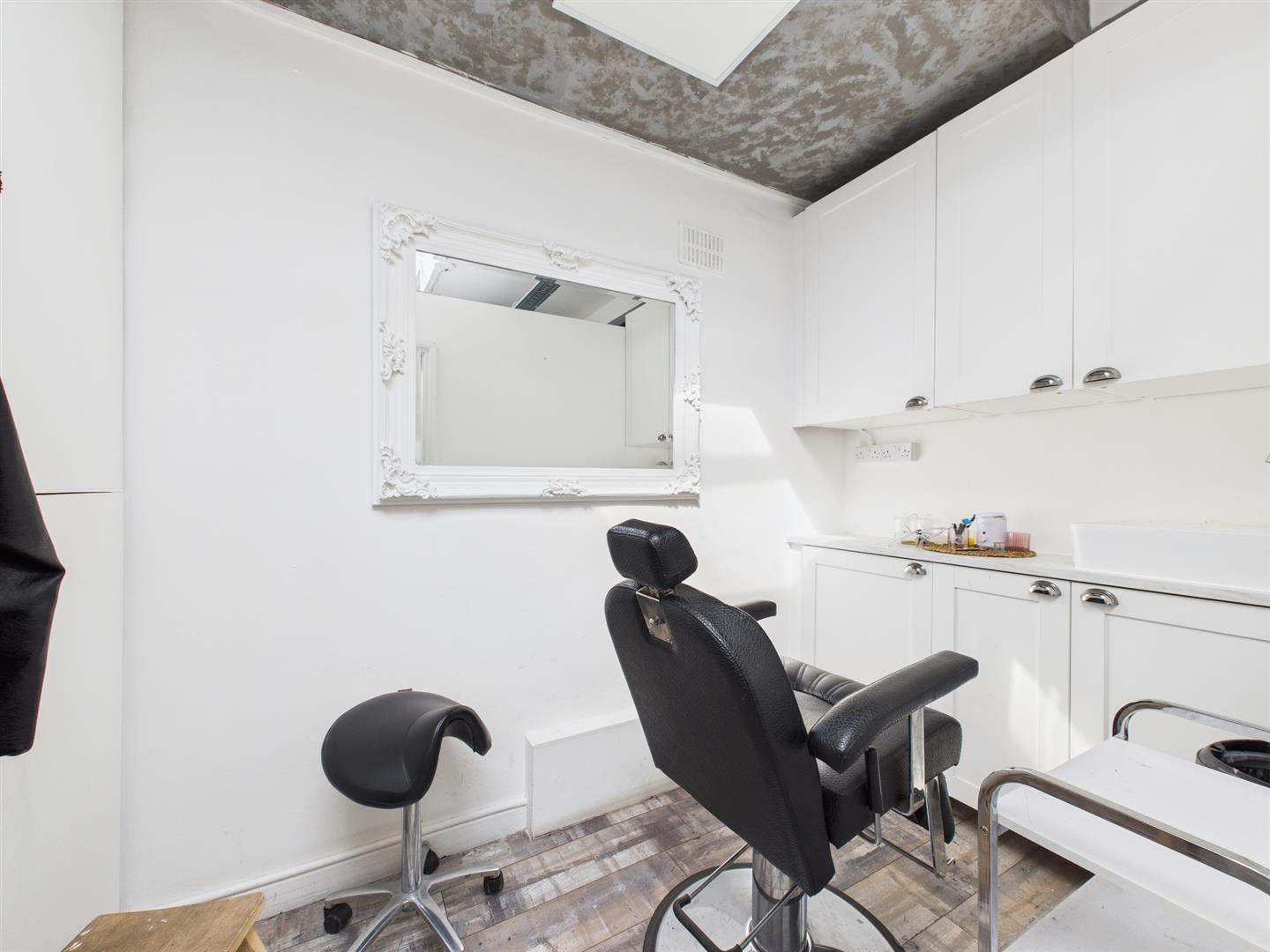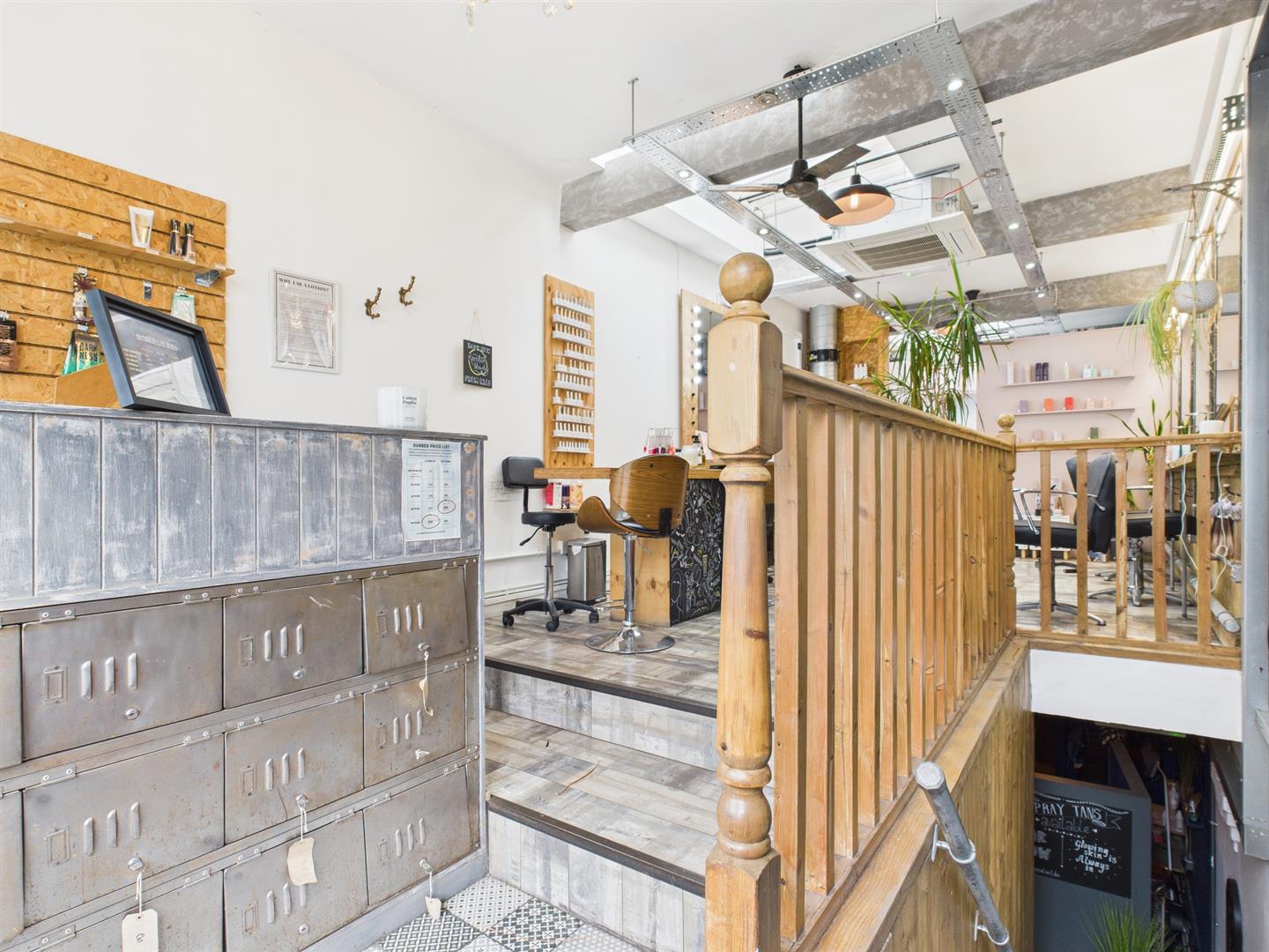 The property features electric roller shutters leading into the unit’s reception area, which has a custom-made front desk and stairs leading up to the main floor which is home to a nail bar with 2 customer stations along with 6 hairdressing stations. Skylights bring in plenty of natural light. There is a colour mixing station with sink, as well as a kitchenette (including a washing machine) and a private treatment room to the rear of the property.