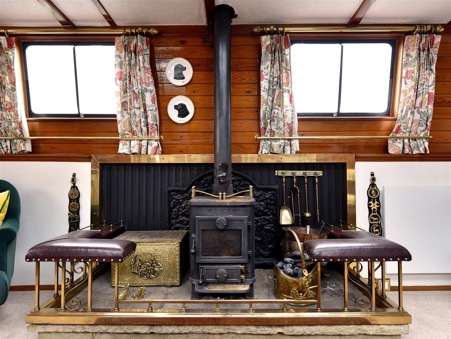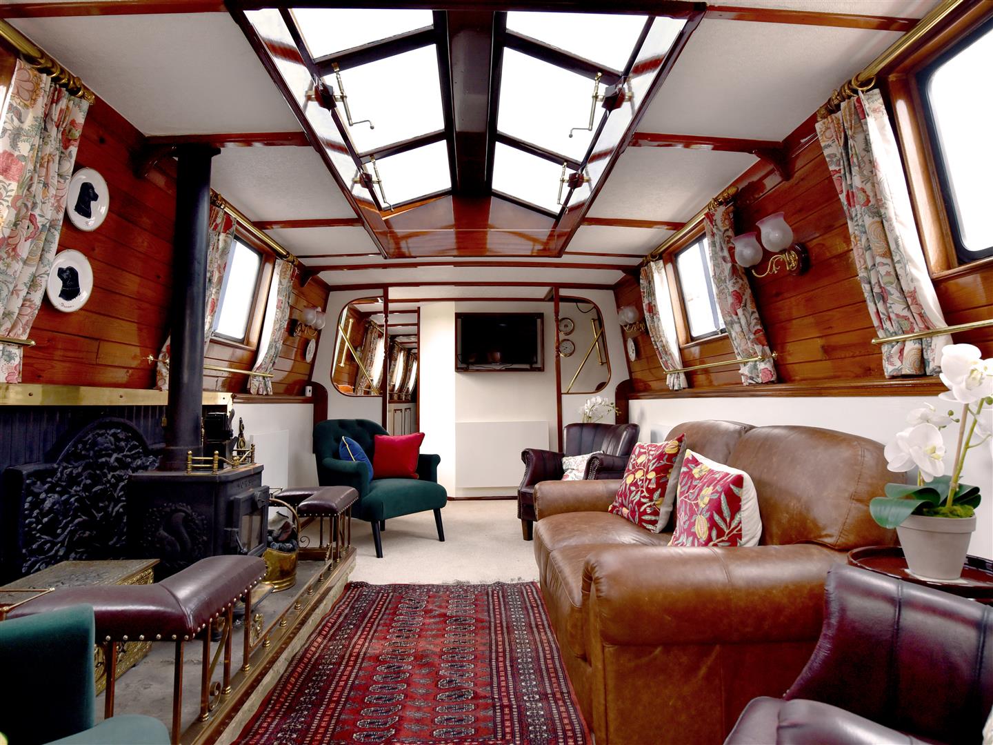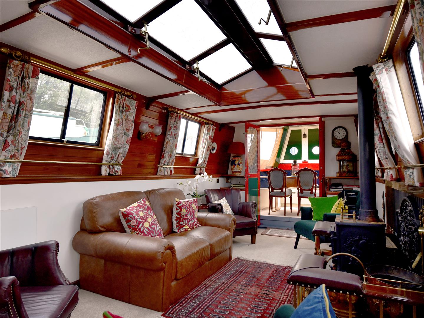 The saloon is fully carpeted, beautifully furnished with armchairs and a sofa, situated opposite a grand fireplace with a solid fuel stove. The boat has electric panel radiators throughout for supplemental heating.