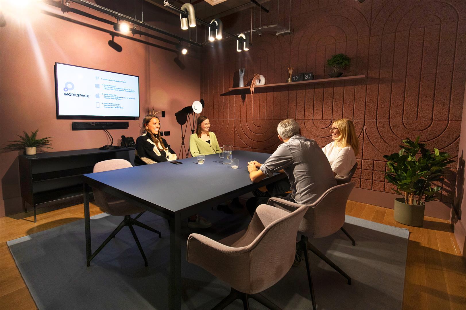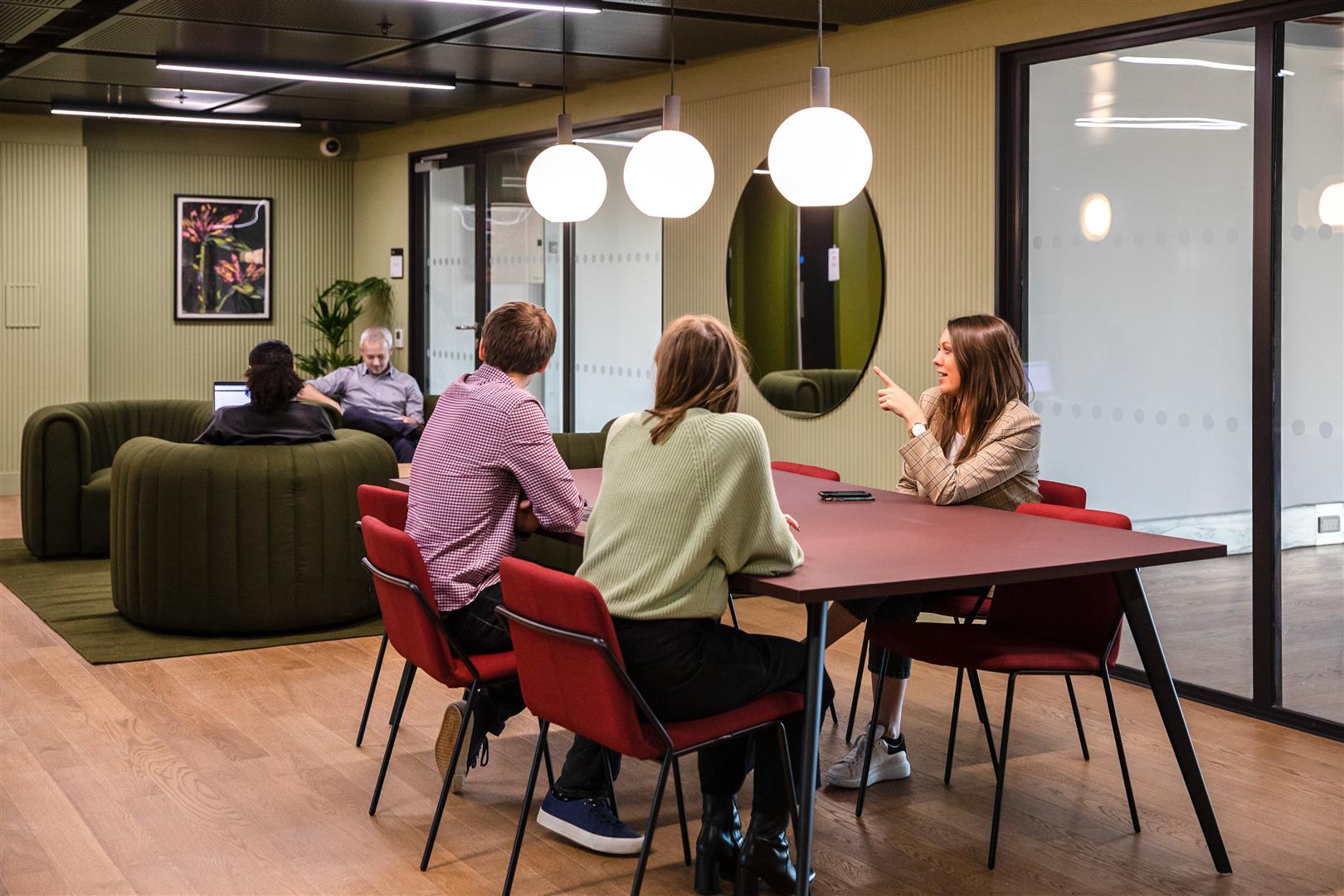 Open plan terraces overlook the canal and the City skyline while concrete walls and terrazzo floors in the staffed reception add to the modern feel and sophisticated palette, with an abundance of botanical plants and industrial lighting.