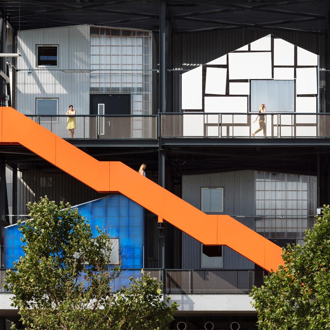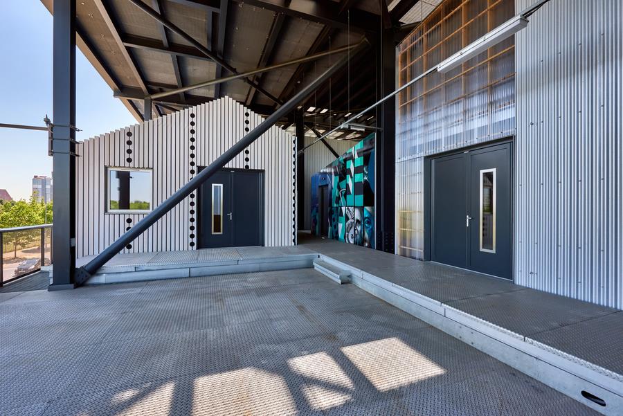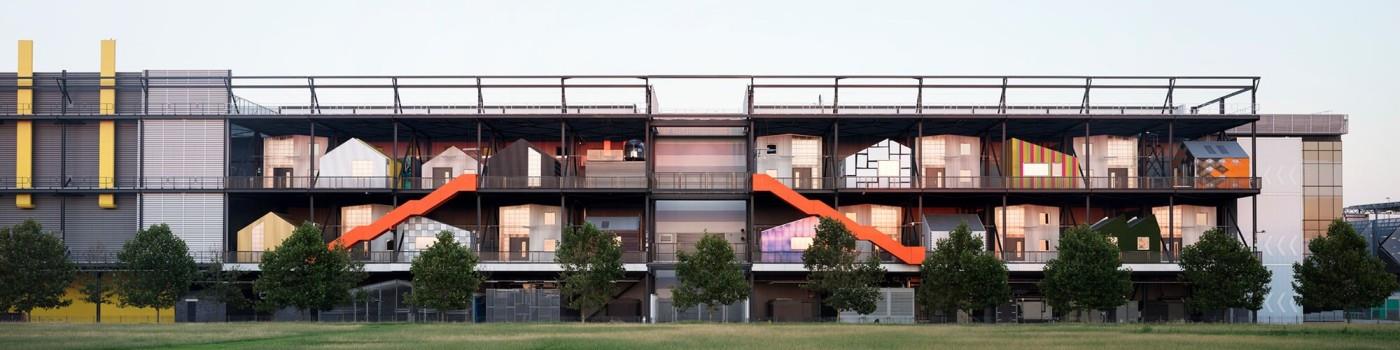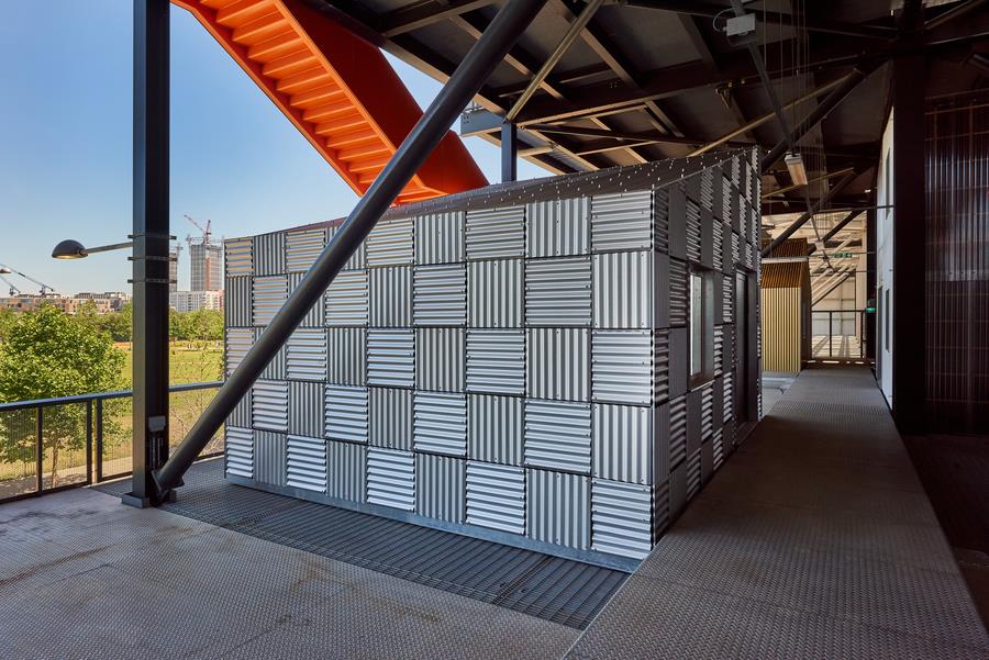 The Trampery on the Gantry is a joyous experiment in utilising open space to provide low-cost studios for local creative businesses. In collaboration with Here East and architects HawkinsBrown, the massive steel structure at the back of the Broadcast Centre from the 2012 Olympics has been repurposed to create 21 freestanding studios with 10,000 square feet of space.