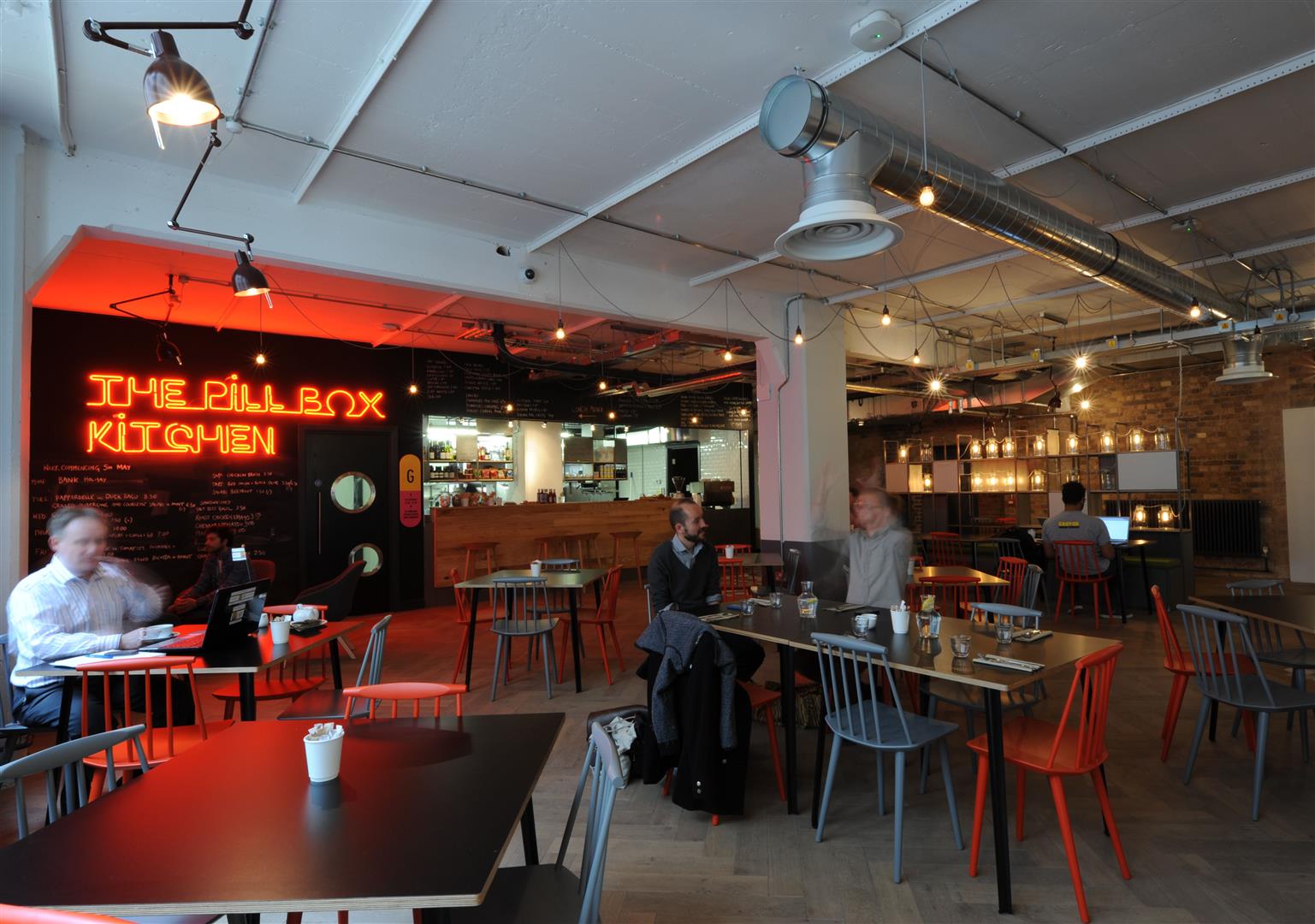This grand, industrial brick building boats amazing outdoor space, with bright benches and quirky pil-shaped seats on an astoturf lawn.