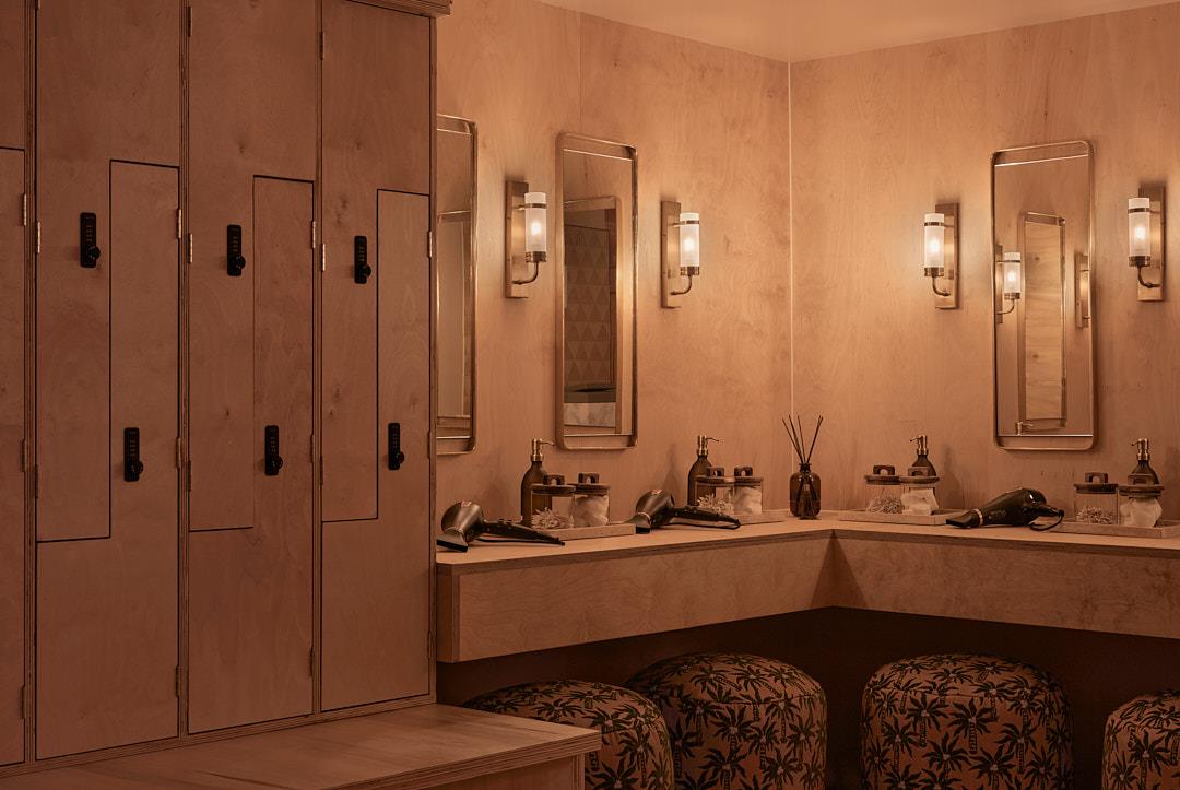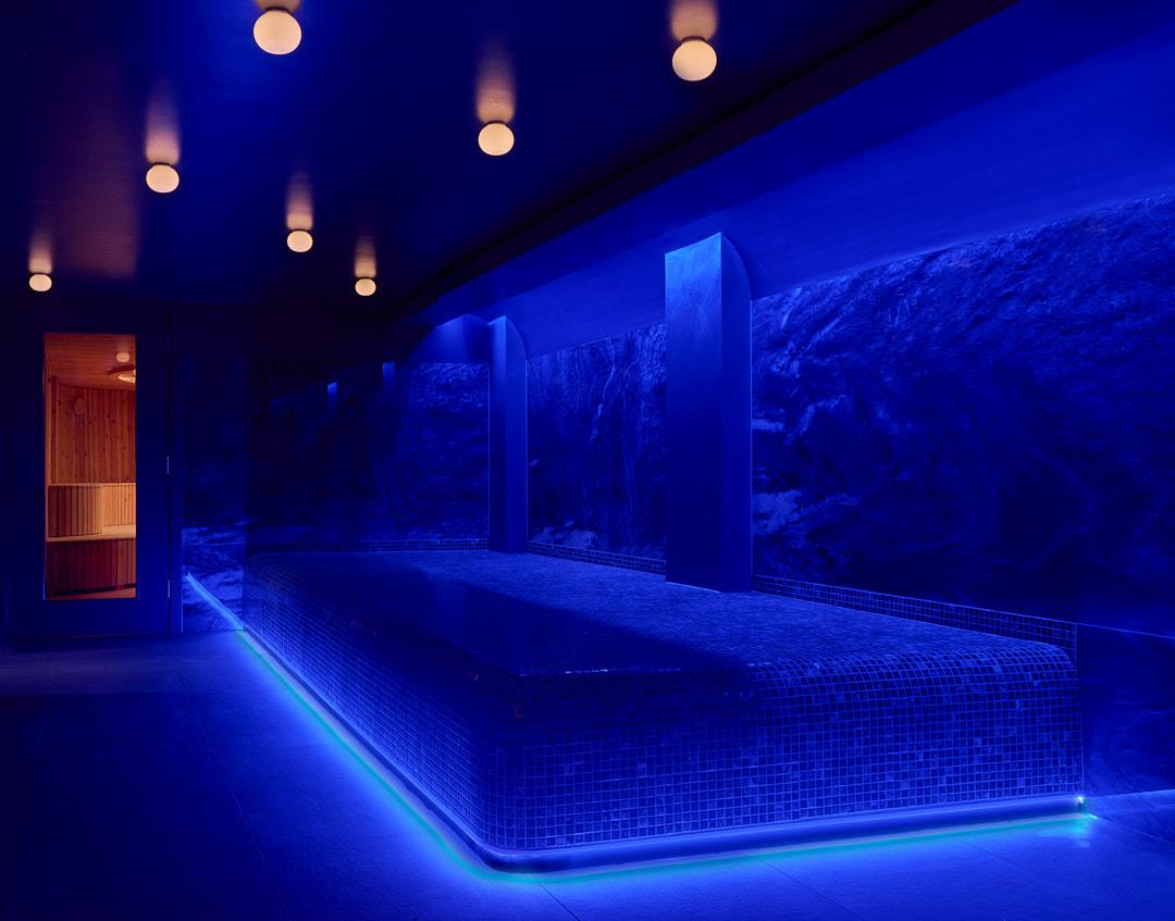 The Sensorium is a 90 sqm spa with 360 degree audio spread across two rooms designed around contrasts of sun and the moon, fire and ice. Immersions move between a 45 sqm 60-90 degree sauna, cold mist and rain showers, and ice baths.