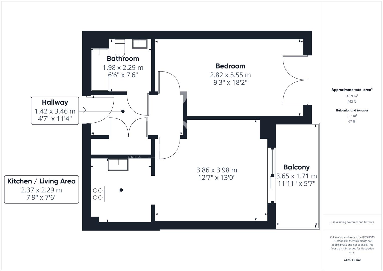 This contemporary property features a bright reception room with access to balcony and modern, open-plan kitchen. There is a spacious bedroom and sleek bathroom fitted with a classic white suite.