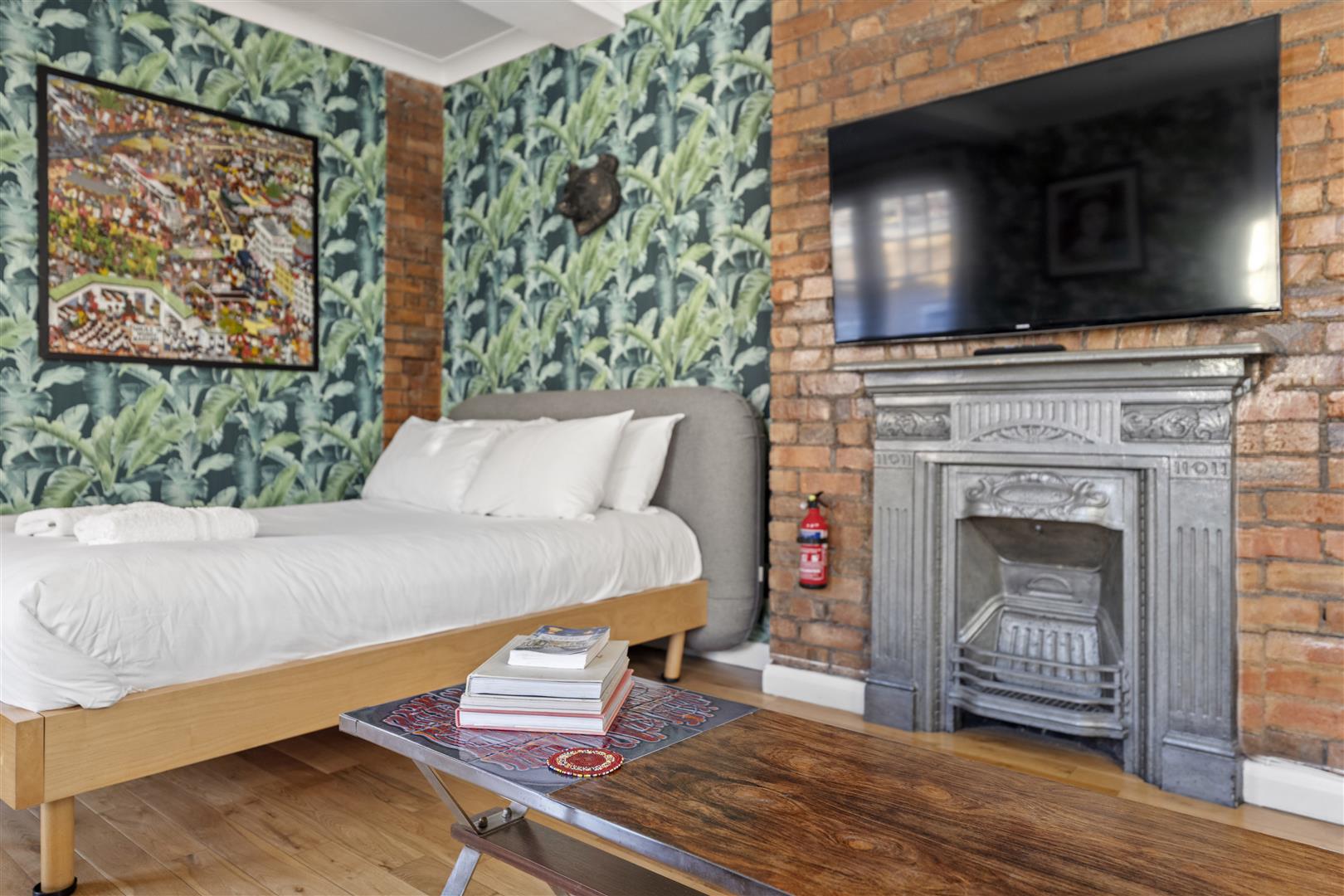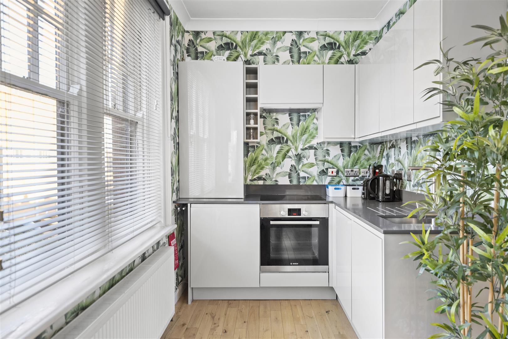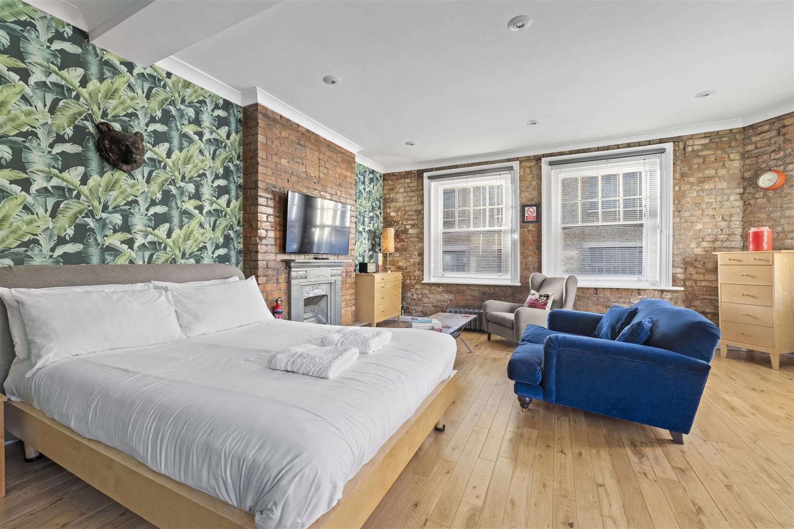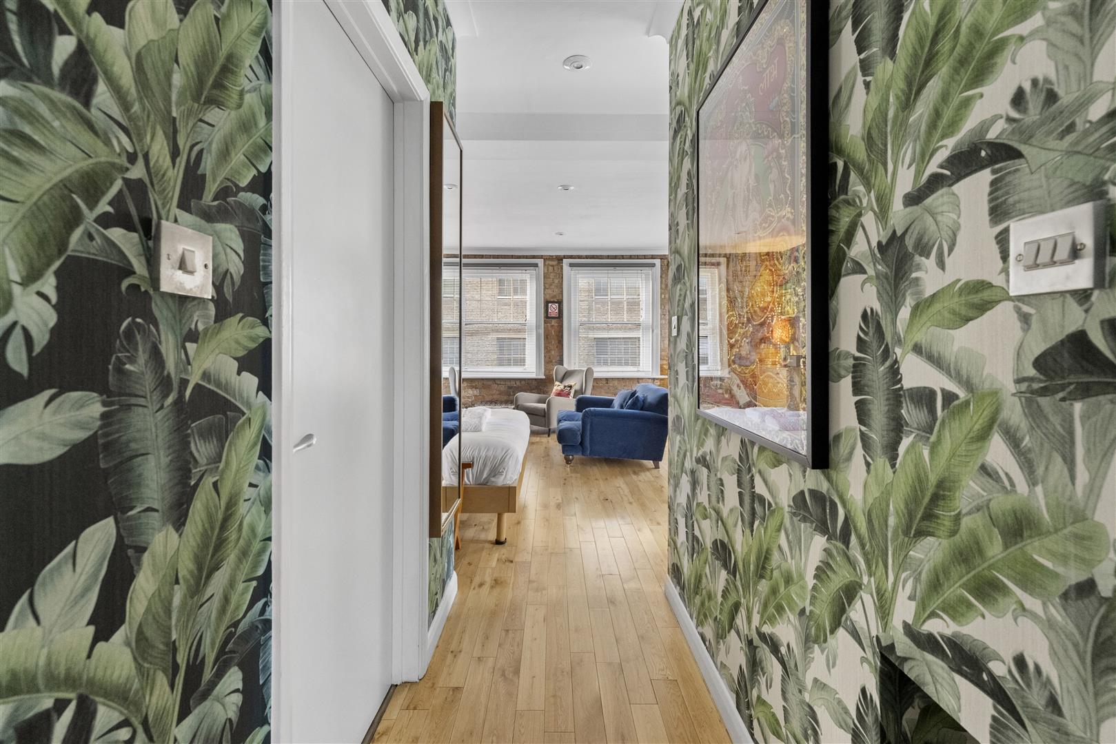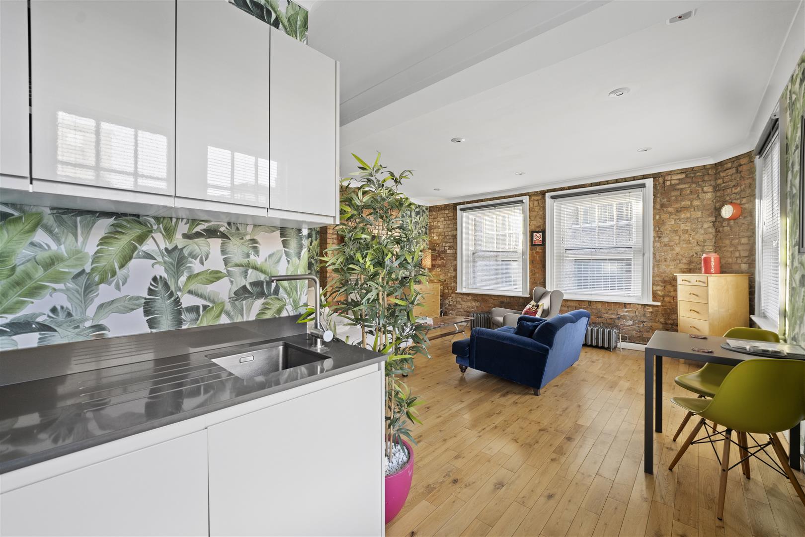Renovated to a high standard throughout, the property features a bright living/sleeping room with oak flooring, exposed brickwork and a contemporary fitted open-plan kitchen with granite worktops.