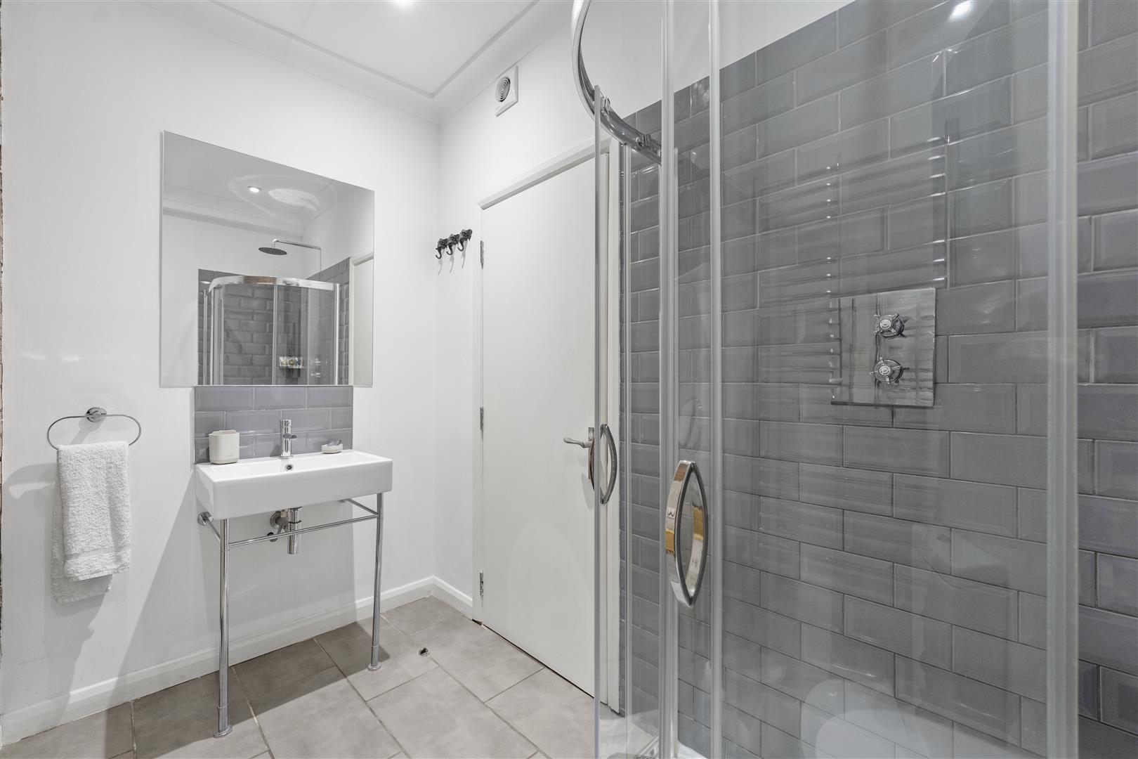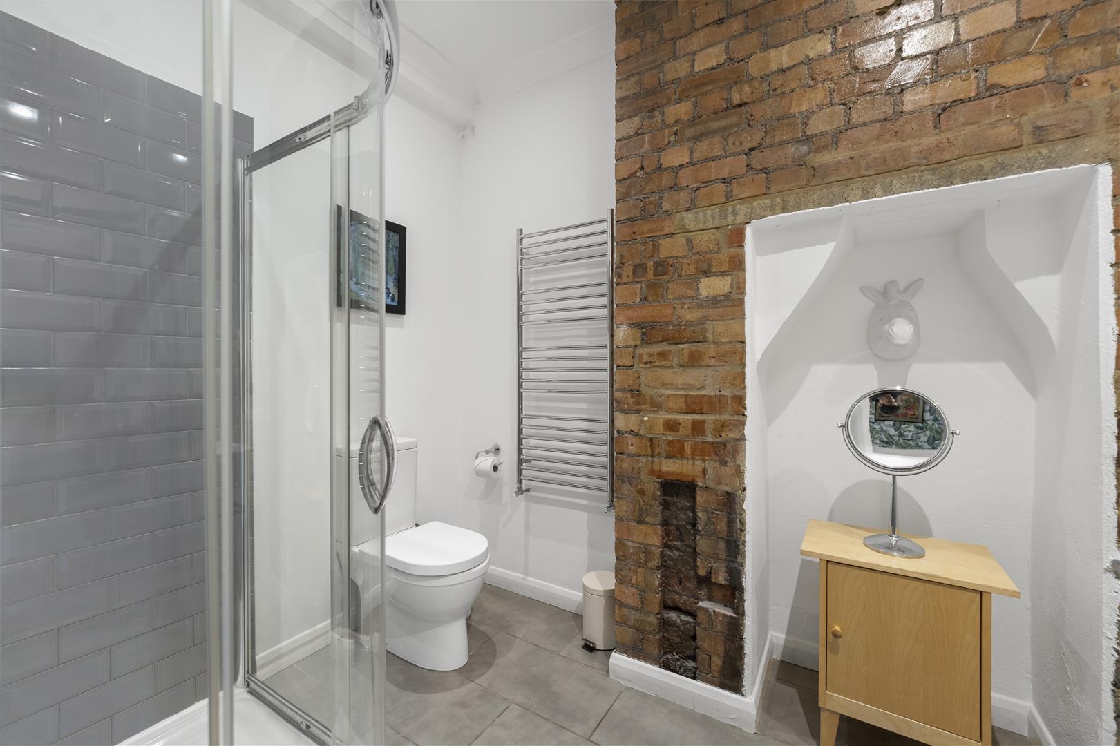 There is a modern fitted bathroom with shower cubical, W/C, sink basin and a mixture of tiled and exposed brick walls.